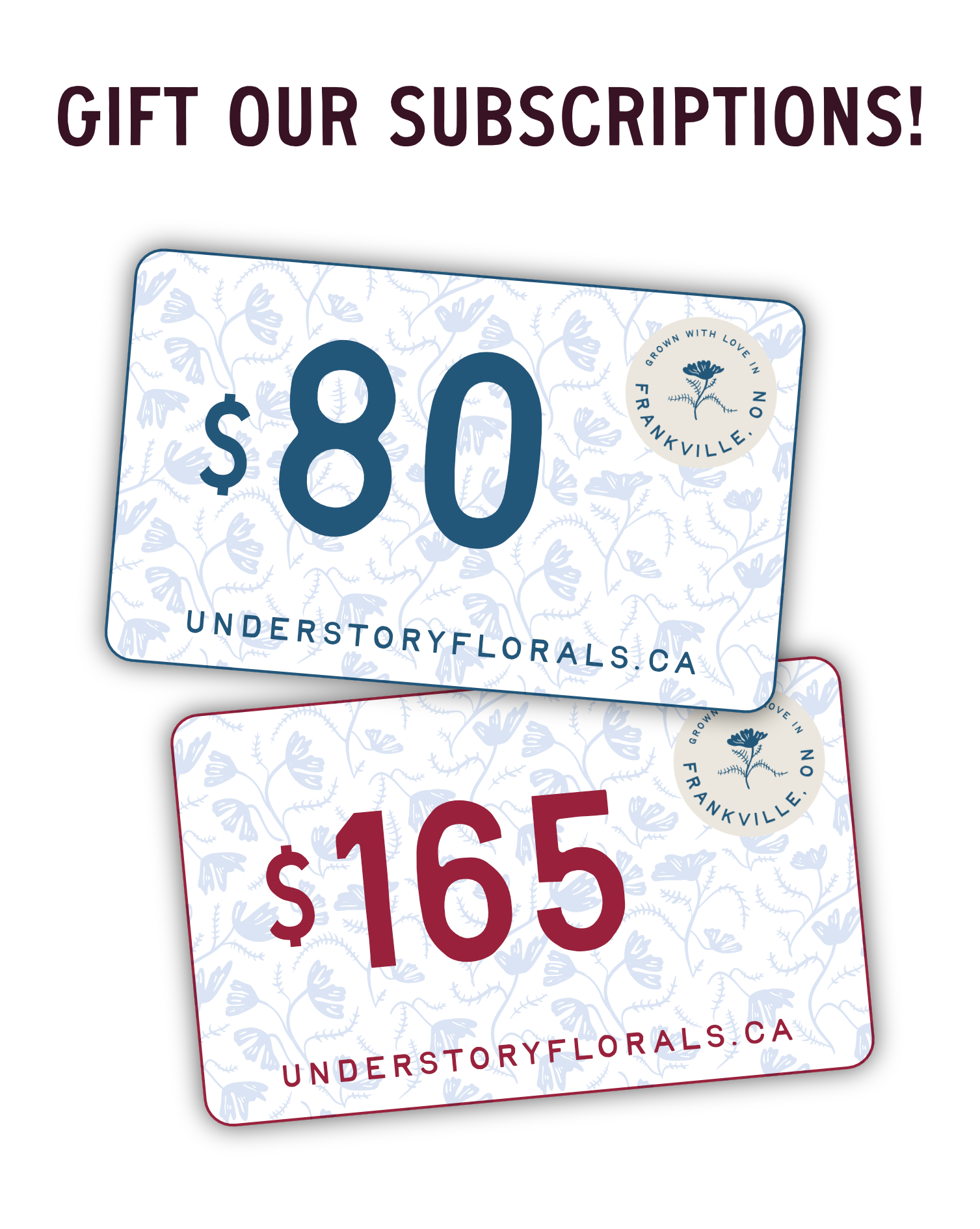 Treat your loved ones to the gift of Ontario-grown, sustainable, specialty cut flowers. Gift cards make the perfect Christmas, Valentine's Day, Mothers' Day, or birthday gift at any time of year. These digital gift cards never expire and can be used online towards a bouquet subscription, à la carte bouquets for pick-up at our flower farm in Frankville, or in person at farmers' markets.